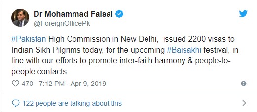 “#Pakistan High Commission in New Delhi, issued 2200 visas to Indian Sikh Pilgrims today, for the upcoming #Baisakhi festival, in line with our efforts to promote inter-faith harmony & people-to-people contacts,” Faisal tweeted.