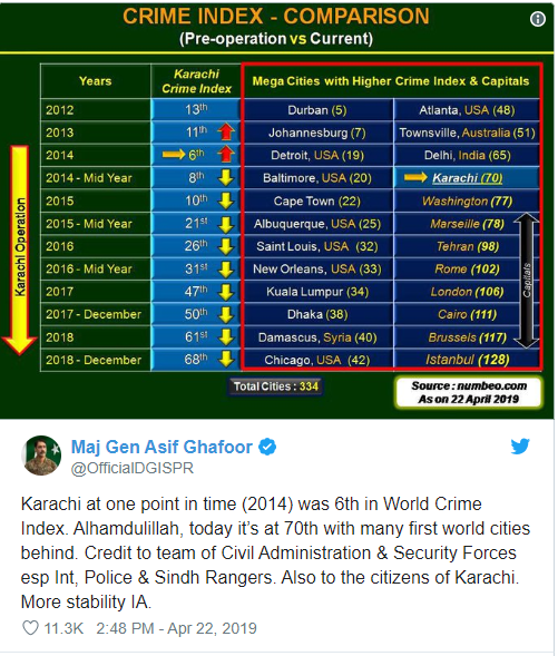 In a tweet, Director-General Inter-Services Public Relations (ISPR) Major General Asif Ghafoor said Karachi has now left behind many first world cities behind in terms of crime safety.