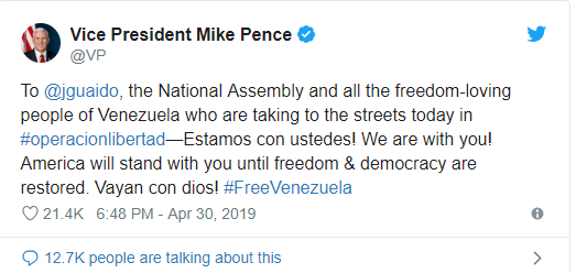 Vice President Mike Pence, Secretary of State Mike Pompeo and national security adviser John Bolton all expressed support for the opposition as its two most prominent figures, Juan Guaido and Leopoldo Lopez, stood with soldiers and called for the people, and the security forces, to rise up against Maduro.