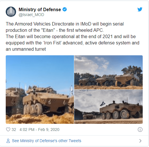 “Today, the Ministry of Defence of Israel announces the start of serial production of the first Eitan APC [armoured personnel carrier],” the ministry said in a Sunday statement.