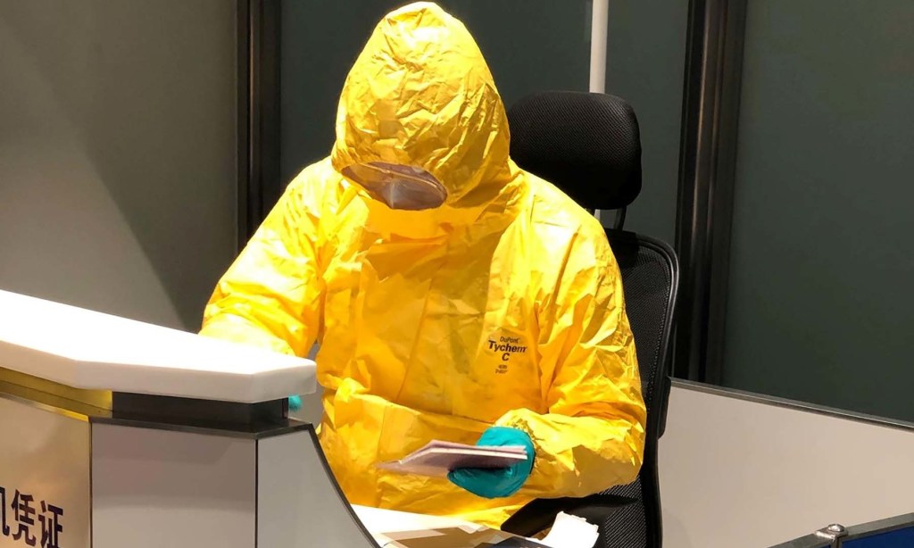 A security officer suited in protective gear checks passports of passengers boarding a cargo plane, chartered by the U.S. State Department to evacuate Americans and Canadians from China due to the outbreak of novel Coronavirus, at Wuhan Tianhe International Airport in Wuhan, China February 7, 2020. Picture taken February 7, 2020. Courtesy of Edward Wang via REUTERS. THIS IMAGE HAS BEEN SUPPLIED BY A THIRD PARTY. MANDATORY CREDIT