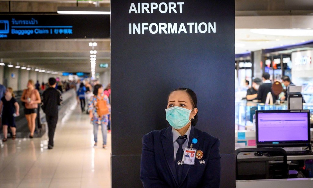 TOPSHOT – Passengers wearing protective facemasks arrive at Suvarnabhumi International Airport in Bangkok on February 9, 2020. – The new coronavirus that emerged in central China at the end of last year has killed more than 800 people and spread around the world. (Photo by Mladen ANTONOV / AFP)
