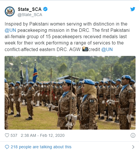 “Inspired by Pakistani women serving with distinction in the UN peacekeeping mission in the DRC,” said a tweet shared on Wells behalf by the State Department’s Bureau of South and Central Asian Affairs.