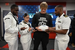 Lt. Brendon Clements, enlisted programs officer, NTAG Miami, right, hands a personalized All-American Bowl football to Ryan Miret, a senior and offensive lineman at Miami Southridge Senior High School, center, during his an All-American Bowl jersey presentation ceremony held on campus. The presentation is part of this year’s Road to the Dome tour, which began Sept. 5, 2025. Sponsored by NBC Sports in partnership with America’s Navy, the nationwide tour highlights top high school football players selected to compete in the Navy All-American Bowl, Jan. 10, 2026. NTAG Miami has 38 recruiting…
